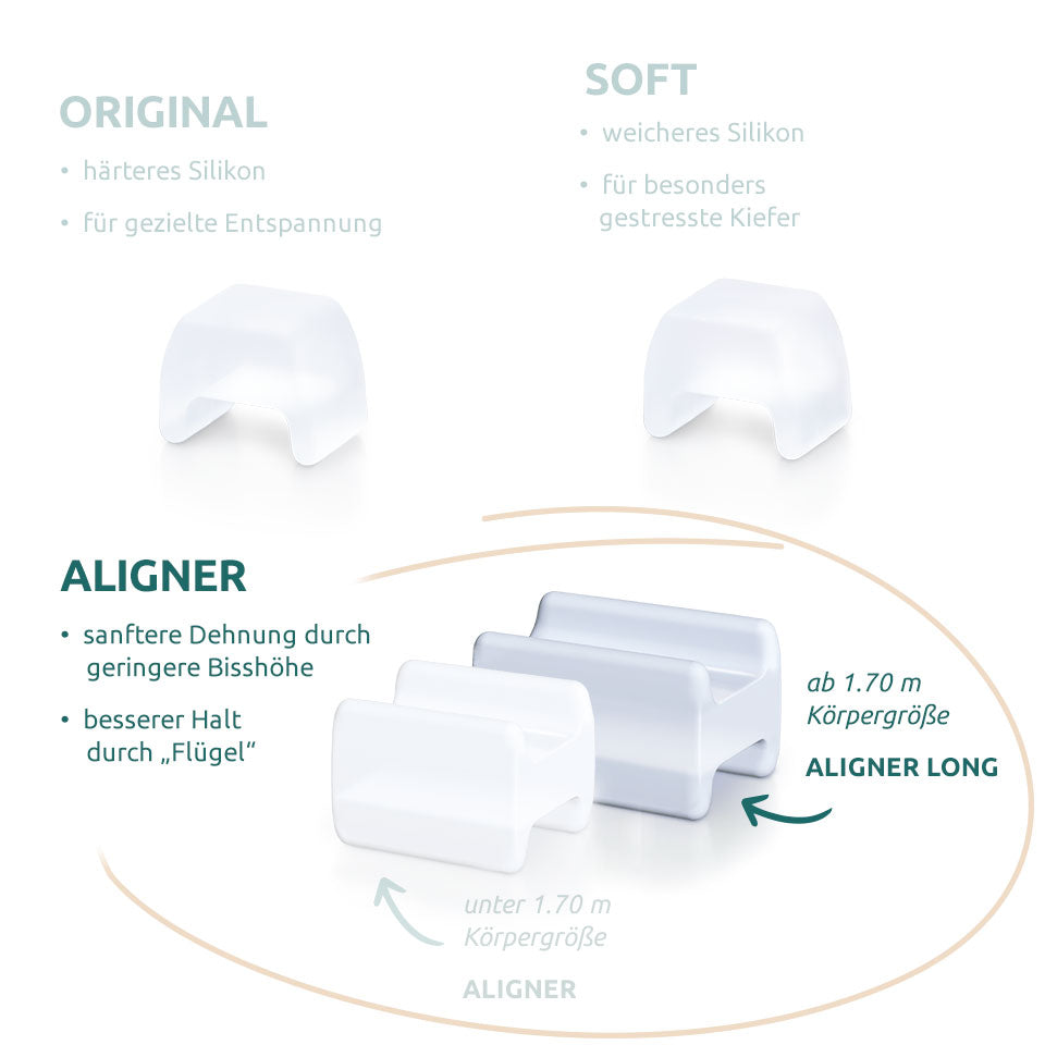 Die TJ-Motion Aligner dehnen sanft dein Kiefergelenk und die Kiefermuskulatur. Dadurch kann deine gesamte Schulter-, Nacken- und Rückenmuskulatur entspannt werden.