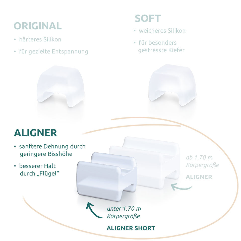 Die TJ-Motion Aligner SHORT dehnen sanft dein Kiefergelenk und die Kiefermuskulatur. Dadurch kann deine gesamte Schulter-, Nacken- und Rückenmuskulatur entspannt werden.